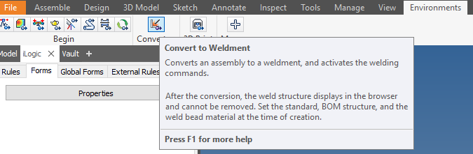 In a weldment assembly use commands on the weld tab to create fillet welds groove welds and cosmetic welds.