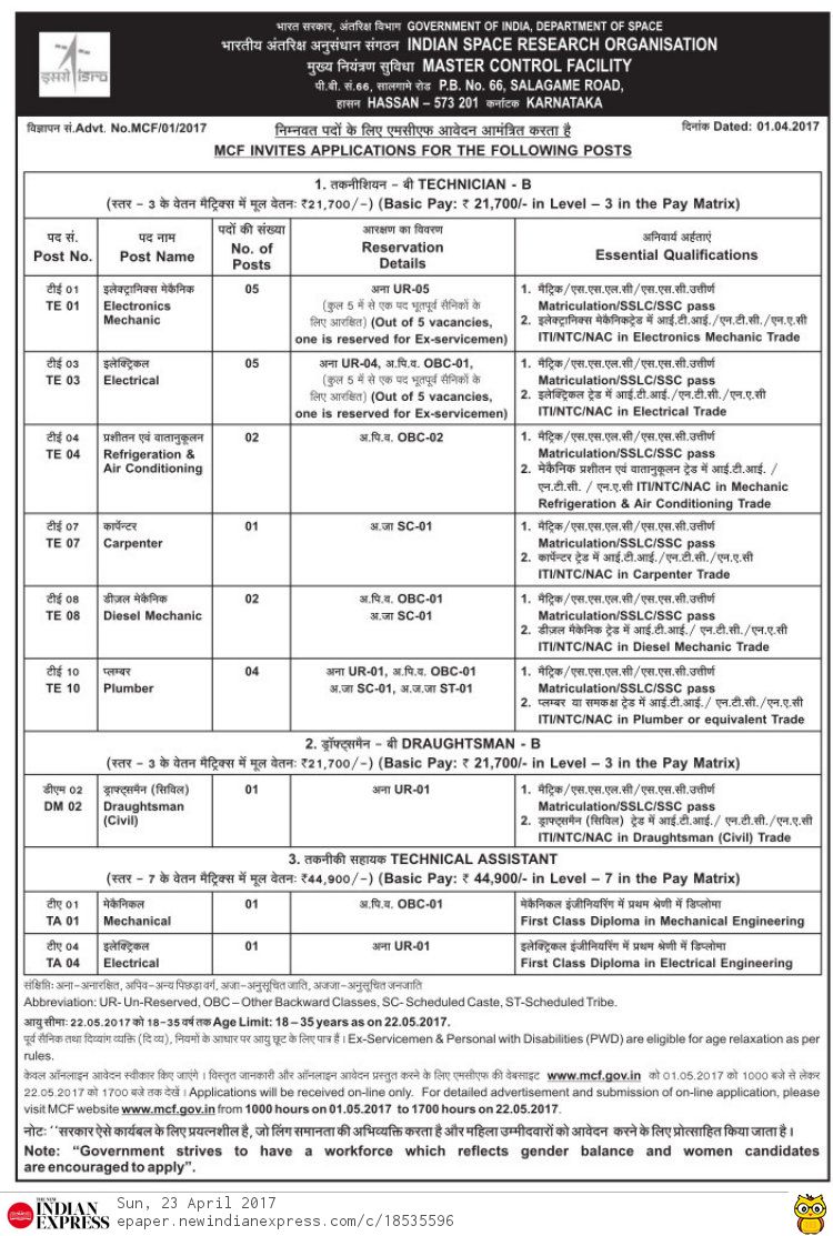 According to the latest employment news the indian space research organization has released the recruitment notification recently the isro has released the notification for technical assistant technician medical officer driver and fireman posts.
